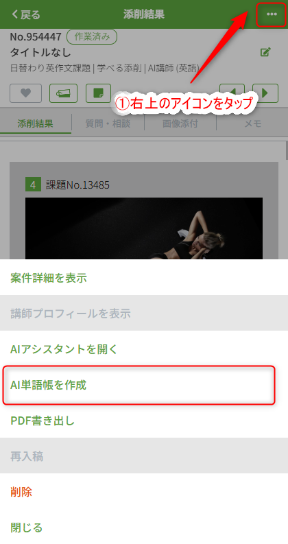 添削結果を開き、右側の「・・・」アイコンをタップすると、「AI単語帳を作成」ボタンが表示されます。