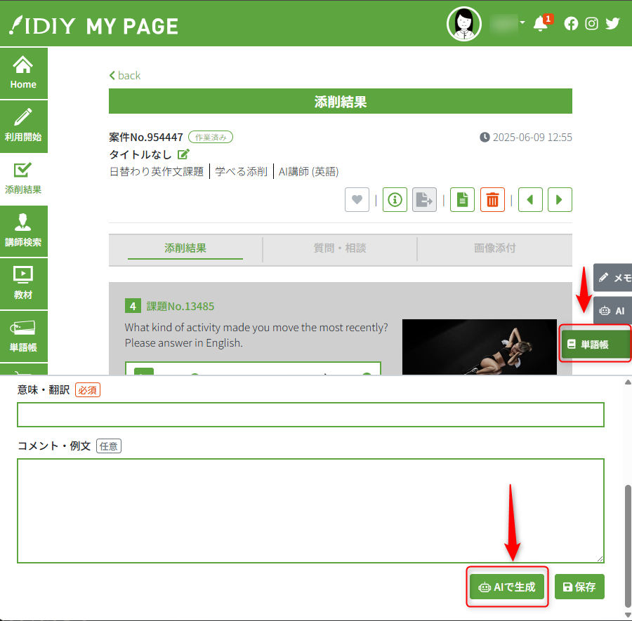 添削結果を開き、右側の「単語帳」タブをクリックすると、「AIで生成」ボタンが表示されます。